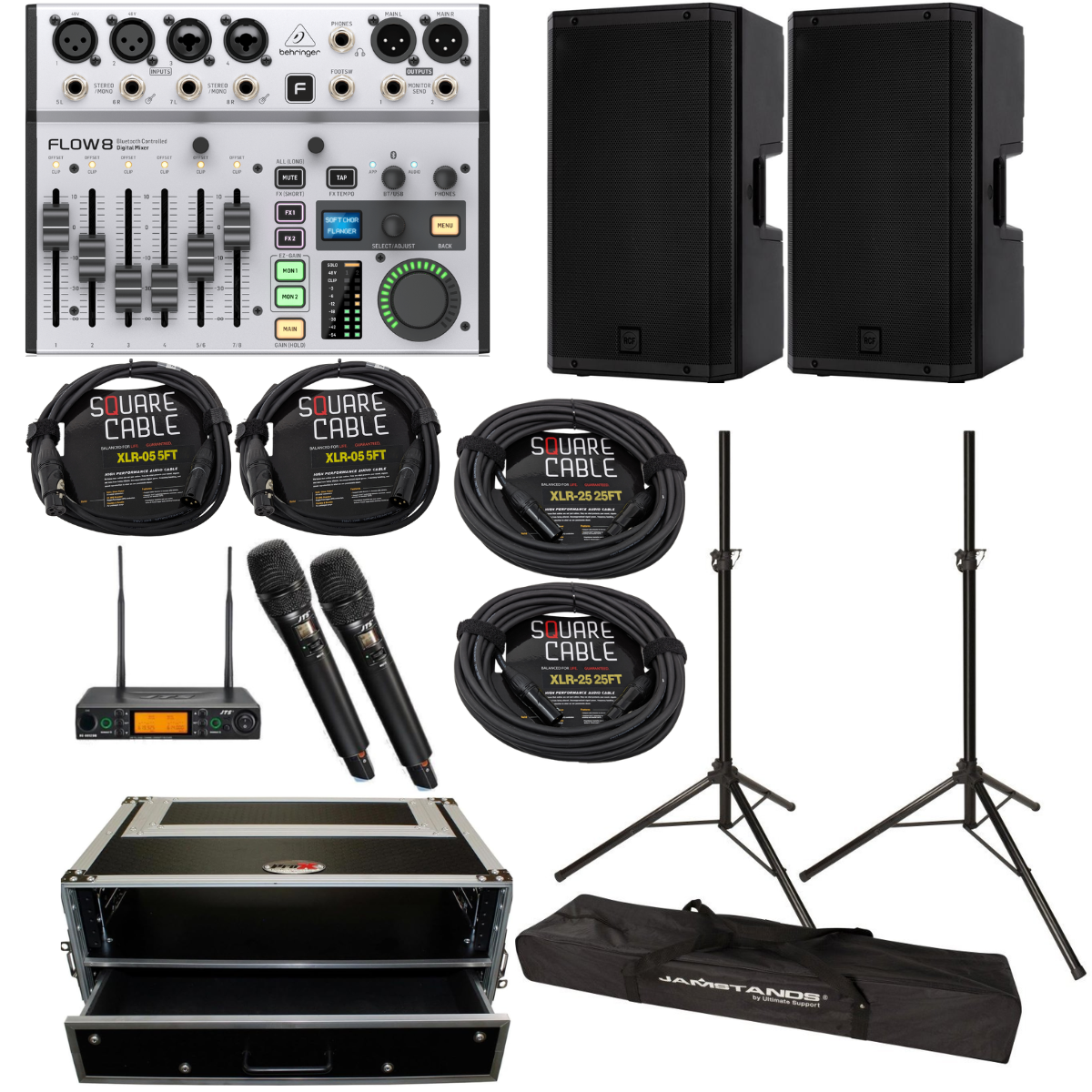 The included Behringer FLOW 8 digital mixer adds flexible control in a compact footprint. With 8 inputs, Bluetooth audio streaming, remote app control, built-in effects, channel EQ and compression, and a 10x2 USB interface, it is ideal for small live rigs, playback systems, streaming, and event production. EZ-GAIN simplifies setup by automatically adjusting gain structure, helping users achieve a clean mix quickly.
